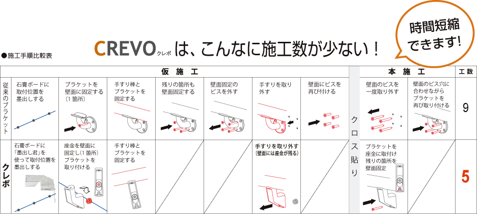 そんな、連続手すりを設置するときに、簡単に施工ができるよう工夫されたのが、CREVOシリーズです!